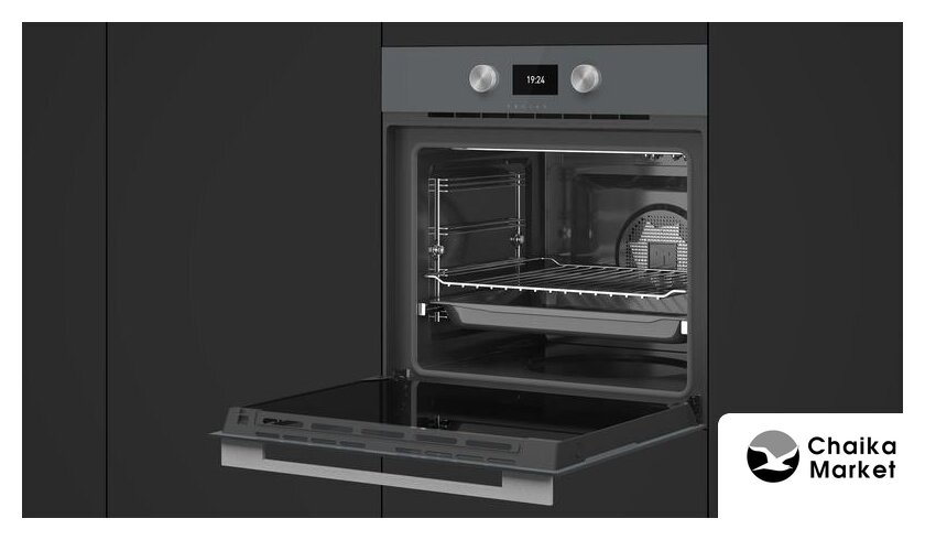 электрический с конвекцией, объем 71 л, 14 режимов, очистка пиролитическая + паровая, 4 стекла в дверце, направляющие проволочные