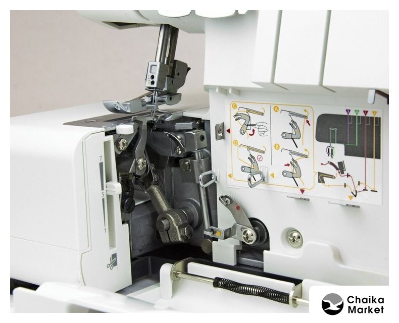 оверлок, рабочих нитей: 2, 3, 4, максимальная ширина строчки: 7 мм, максимальная длина строчки: 4 мм, регулировка давления лапки, скорость шитья: 1300 об/мин