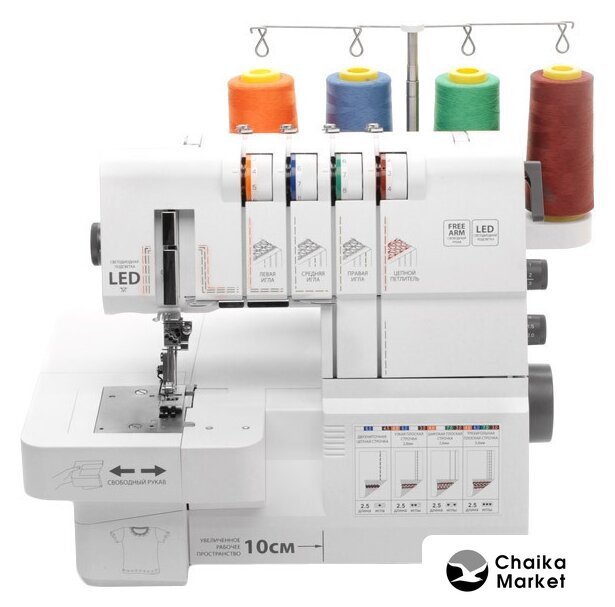 оверлок, рабочих нитей: 4, максимальная ширина строчки: 4 мм, максимальная длина строчки: 4.6 мм, скорость шитья: 5500 об/мин