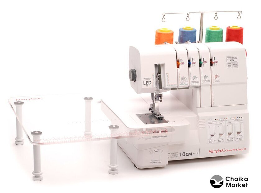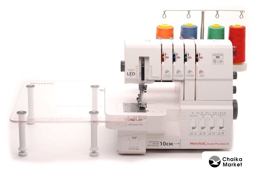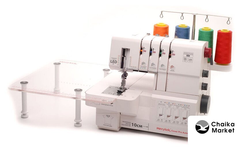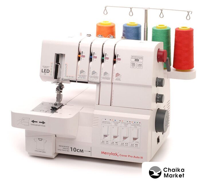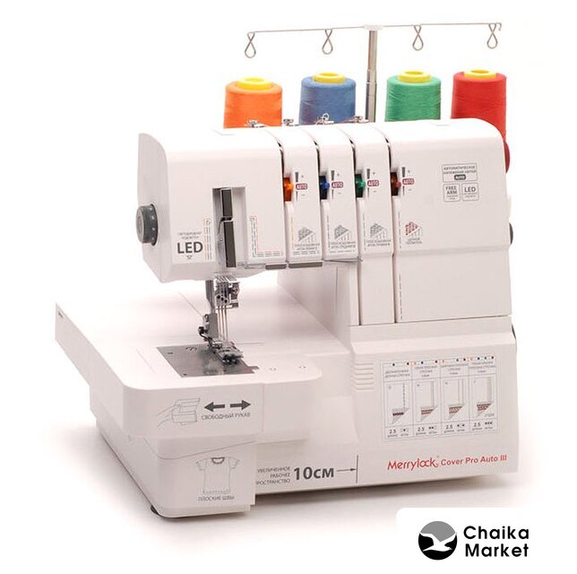 распошивальная машина, рабочих нитей: 7, максимальная ширина строчки: 6 мм, максимальная длина строчки: 4 мм, регулировка давления лапки, скорость шитья: 1000 об/мин