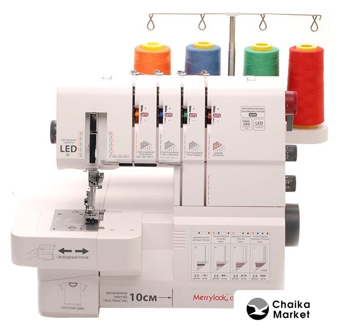оверлок, рабочих нитей: 5, максимальная ширина строчки: 5 мм, максимальная длина строчки: 4.6 мм, скорость шитья: 5500 об/мин
