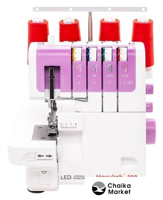 оверлок, рабочих нитей: 3, 4, нитей для плоского шва: 2, 3, 4, регулировка давления лапки, скорость шитья: 1300 об/мин