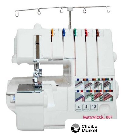 оверлок; рабочих нитей: 2, 3, 4, 5; нитей для плоского шва: 3; максимальная ширина строчки: 7 мм; максимальная длина строчки: 4 мм; регулировка давления лапки