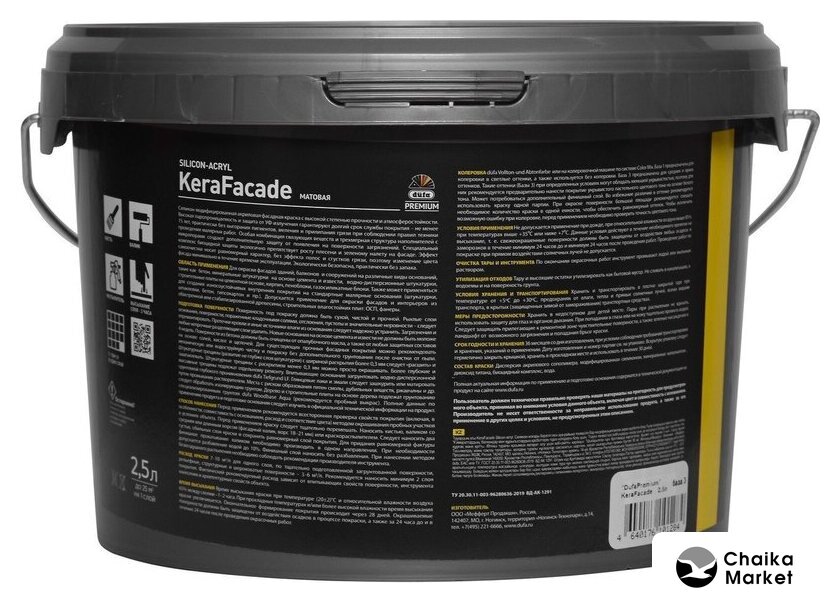 | Свойства | быстросохнущая, влагостойкая, износостойкая, светоустойчивая, термостойкая, щелочестойкая, защита от грибка, высокопрочная, высокая адгезия к основанию, высокоукрывистая, водоотталкивающая |