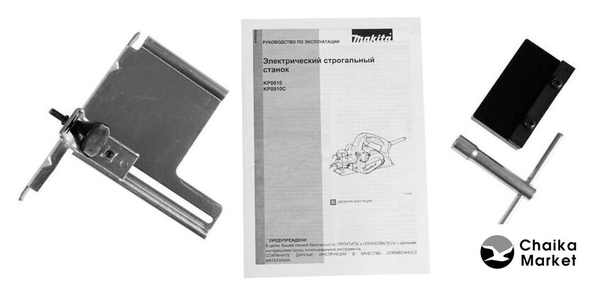 Комплект поставки | Шаблон для установки ножа, Ограничитель глубины выборки паза, Параллельный упор, Лезвия для рубанка, Торцевой гаечный ключ |