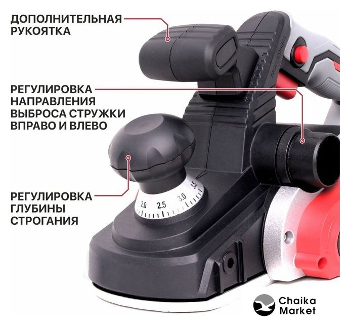 | Комплект поставки | - Рубанок, - коробка, - ключ торцевой, - упор параллельный, - ограничитель глубины четверти, - мешок для стружки, - приспособление для заточки ножей, - приспособление для юстировки ножей,- руководство по эксплуатации |