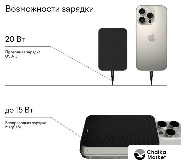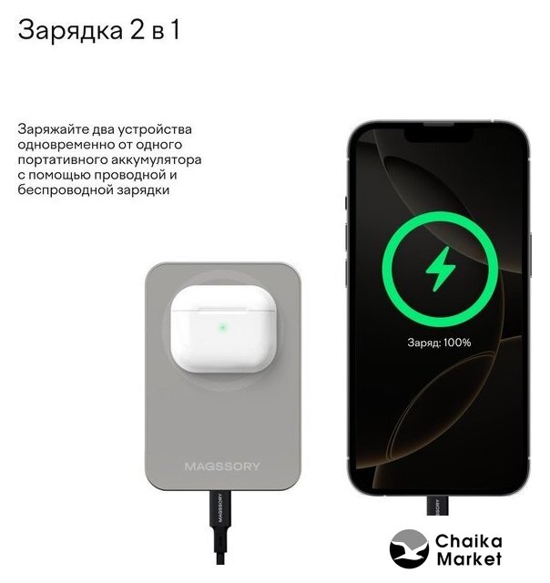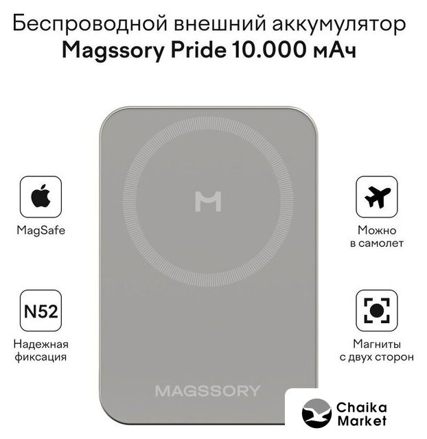 10000 мА·ч (37 Вт·ч), выходы: 1 x 5V/9V/12V (3000 мА), быстрая зарядка, беспроводная зарядка, поддержка MagSafe, подставка