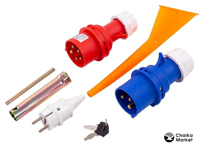 Комплектация | Генератор, ключ свечной, ключ зажигания - 2 шт., вилка 230В/16А, вилка 230В/32А, вилка 400В/16А, руководство по эксплуатации, гарантийный талон. |
