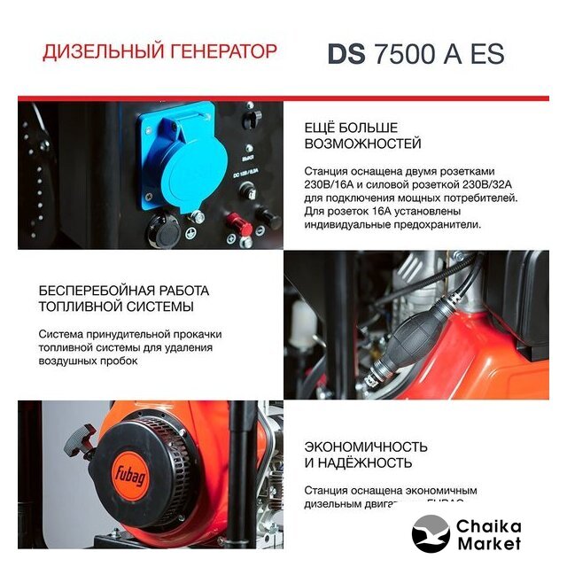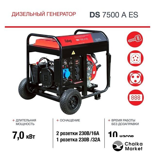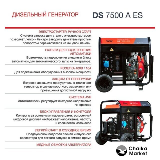 дизельный, исполнение: открытое, 6 кВт, запуск: ручной/электростартер/автозапуск, время непрерывной работы: 8 ч, 126 кг