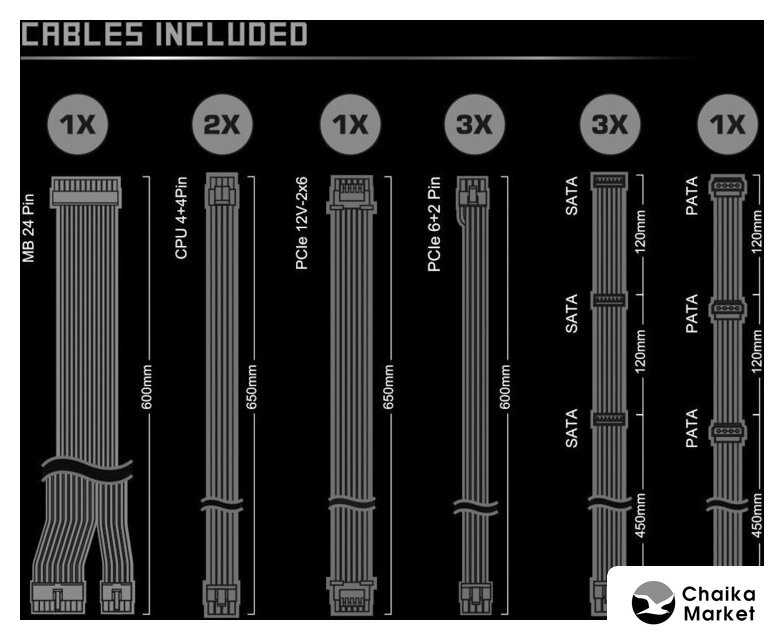 | Комплектация | - кабель питания материнской платы 24 pin- кабель PCIe Gen5- 2 кабеля питания процессора 4+4 pin- 3 кабеля питания видеокарты PCIe 6+2 pin- кабель питания периферии IDE 4 pin- 3 кабеля питания SATA |