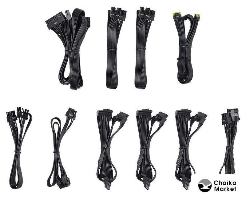 | Комплектация | - кабель питания материнской платы 24 pin- кабель PCIe Gen5- 2 кабеля питания процессора 4+4 pin- 2 кабеля питания видеокарты PCIe 6+2 pin- кабель питания периферии IDE 4 pin- 3 кабеля питания SATA |