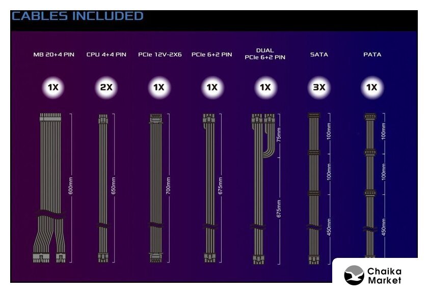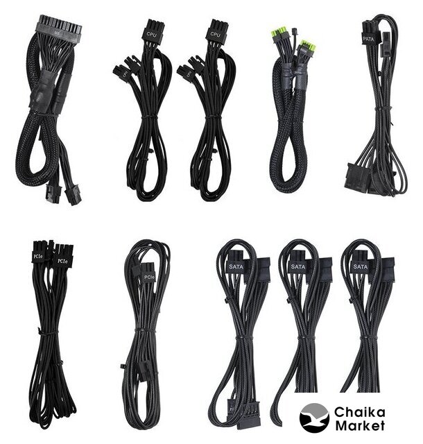 | Комплектация | - кабель питания материнской платы 24 pin- два кабеля процессора 4+4 pin- два кабеля PCIe 6+2 pin- один кабель PCIe Gen5 12V-2x6- кабель 4-pin Peripheral- три кабеля SATA |