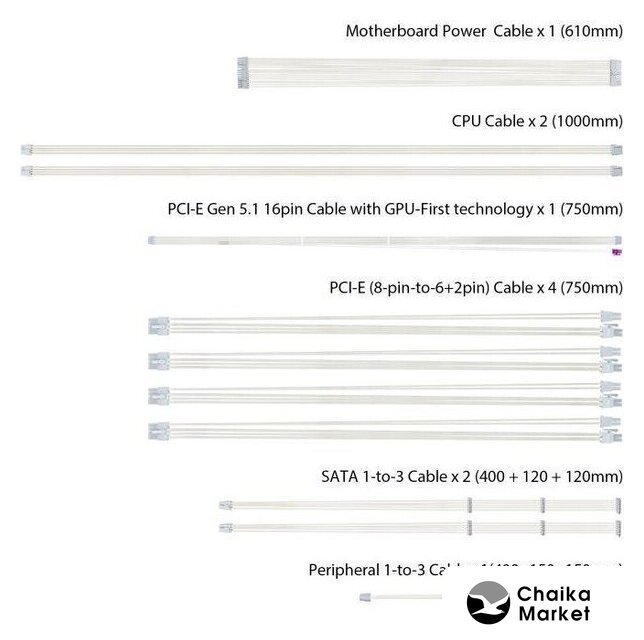 | Комплектация | - кабель питания- кабель питания материнской платы 24 pin (610 мм)- два кабеля CPU 4+4 pin (1000 мм)- кабель PCI-E Gen 5.1 (16-pin-to-16-pin) (750 мм)- четыре кабеля PCI-E (8-pin-to-6+2 pin) (750 мм)- два кабеля SATA 1-to-3 (400+120+120 мм)- кабель Peripheral 1-to-3 (400+150+150 мм)- наклейка ROG Strix DIY- руководство пользователя |