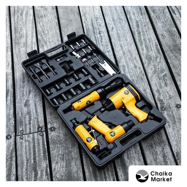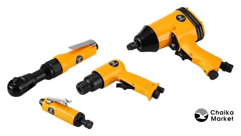 | Состав набора | пневмогайковерт, пневмодолото, пневмотрещотка, пневмошлифмашинка |