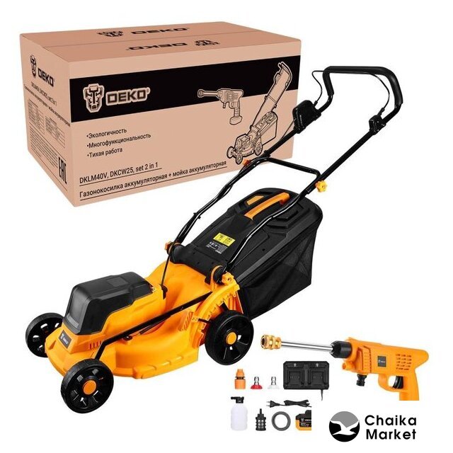 Комплектация | - Газонокосилка - 1 шт.- Рукоятка (состоит из 2-х частей) - 1 шт.- Травосборник - 1 шт.- Крепежный комплект (барашковая гайка - 4 шт, винт - 2 шт) - 1 шт.- Держатель кабеля - 2 шт.- Мойка высокого давления - 1 шт.- Штанга - 1 шт.- Коннектор для шланга - 1 шт.- Фильтр для шланга - 1 шт.- Шланг - 1 шт.- Насадка-распылитель - 2 шт.- Емкость для моющего средства - 1 шт.- Аккумулятор 5,0 Ач - 2 шт.- Зарядное устройство - 2 шт.- Ключ - 1 шт.- Инструкция- Коробка |
