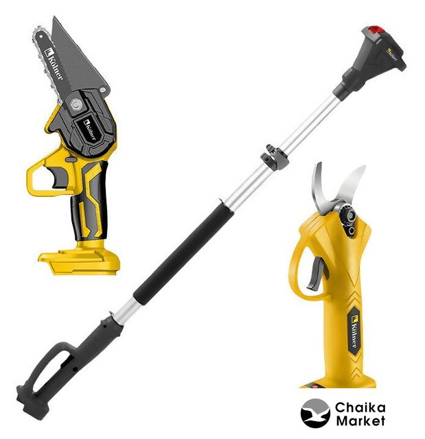 Комплектация | - Секатор аккумуляторный.- Пила цепная аккумуляторная.- Шина.- Цепь.- Телескопическая штанга.- Плечевой ремень.- Набор инструментов.- Аккумуляторы 2 шт.- Стационарное зарядное устройство. |