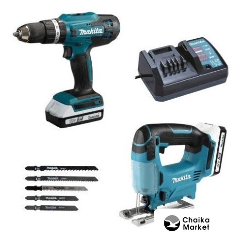 Комплектация | - Дрель-шуруповерт аккумуляторная ударная Makita HP488- Лобзик аккумуляторный Makita JV183- Набор полотен для лобзика- Зарядное устройство- Аккумулятор 1.5 Ач - 2 шт |