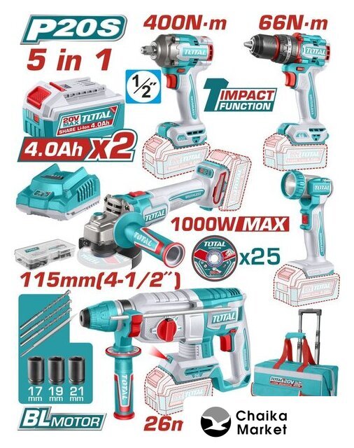 Комплектация | - Дрель-шуруповерт ударная TOTAL TIDLI206681- Гайковерт TOTAL TIWLI20401- Перфоратор аккумуляторный TOTAL TRHLI20268- Углошлифмашина аккумуляторная TOTAL TAGLI27153- Фонарь аккумуляторный TOTAL TWLI2058- Аккумулятор 4,0 Ач TFBLI20021 - 2 шт.- Зарядное устройство TFCLI2001 - 1 шт.- Аксессуары для дрели-шуруповерта - 47 шт.- Абразивные отрезные диски по металлу 115 мм - 25 шт.- Зубило - 1 шт.- Бур - 3 шт.- Торцевые головки (17, 19, 21 мм) - 3 шт.- Сумка |