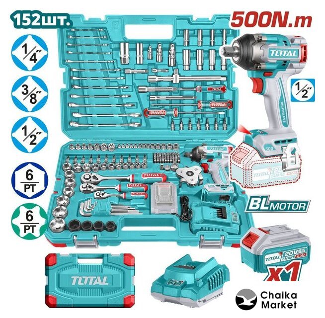 Комплектация | Гайковерт TOTAL TIWLI2050 - 1 шт.Аккумулятор 4,0 А·ч TFBLI2002 - 1 шт.Зарядное устройство TFCLI2001E - 1 шт.Трещотка 1/4" - 1 шт.Торцевые головки 1/4" (4 / 4,5 / 5 / 5,5 / 6 / 7 / 8 / 9 / 10 / 11 / 12 / 13 / 14) - 13 шт.Головки 1/4"x32(L) с битами: Н3 / H4 / H5 / H6 / H8 / T8 / T10 / T15 / T20 / T25 / T30 / T40 / SL5,5 / SL6,5 / PH2 / PH3 / PZ2 / PZ3 - 18 шт.Глубокие головки 1/4" DR 50 мм(L): 8, 9, 10, 12 мм - 4 шт.Удлинитель 1/4" DR x 50 мм - 1 шт.Вороток: 1/4" x 150 мм - 1 шт.Карданный шарнир 1/4" - 1 шт.Трёхходовой адаптер 1/4"(F) x 1/4"(M) - 1 шт.Держатель бит: 1/4"x6,35 мм - 1 шт.Биты 6,35x25мм (L): T5 / T6 / T7 / T8 / T9 / T10 / T15 / T20 / T25 / T30 / PH1 / PH2 / PH2 / PH3 / PH4 / PZ1 / PZ2 / PZ2 / PZ3 / PZ4 / SL3 / SL3 / SL4 / SL4 / SL5 / SL5.5 / SL6 / SL6.5 / SL7 / SL7 / H2 / H3 / H3 / H4 / H4 / H5 / H5 / H6 / H7 / H7 - 40 шт.Ударные головки 17, 19, 21, 22 мм - 4 шт.Трещотка 1/2" - 1 шт.Карданный шарнир 1/2" - 1 шт.Головки 1/2" (21, 22, 23, 24, 27, 30, 32 мм) - 7 шт.Свечные головки 1/2" (16, 21 мм) - 2 шт.Удлинители: 1/2" (125 мм, 250 мм) - 2 шт.Трёхсторонний адаптер 1/2": 3/8"(M) x 1/2"(F) - 1 шт.Шестигранные головки 3/8" (10, 11, 12, 13, 14, 15, 16, 17, 18, 19 мм) - 10 шт.Глубокие шестигранные головки 3/8" (13, 14, 15, 17 мм) - 4 шт.Звездообразные головки 3/8" (E10, E11, E12, E14, E16, E18, E20) - 7 шт.Вороток 3/8" - 1 шт.Удлинители 3/8" (75 мм, 150 мм) - 2 шт.Карданный шарнир 3/8" - 1 шт.Трёхсторонний адаптер 3/8": 3/8"(F)x3/8"(M) - 1 шт.Ключ для масляного фильтра - 1 шт.Отвёртки: SL6.5x150, PH2x150 - 2 шт.комбинированные ключи 6, 8, 9, 10, 11, 12, 13, 14, 15, 17, 18, 19 - 12 шт.Ключи Torx T10, T15, T20, T25, T27, T30, T40, T45, T50 - 9 шт.Кейс |