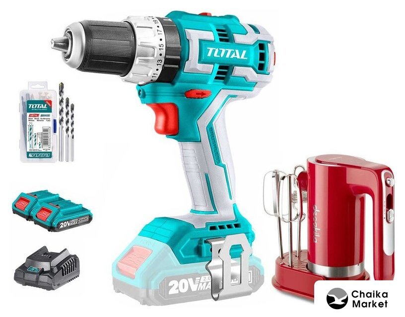 Комплектация | - Дрель-шуруповерт ударная TOTAL TIDLI20608 - 1 шт.- Аккумулятор 2,0 А*ч - 2 шт.- Быстрое зарядное устройство - 1 шт.- Набор оснастки и крепежа - 50 шт.- Миксер Decakila KMMX006R - 1 шт.- Венчики - 2 шт.- Капучинатор (вспениватель молока) - 1 шт.- Инструкция |