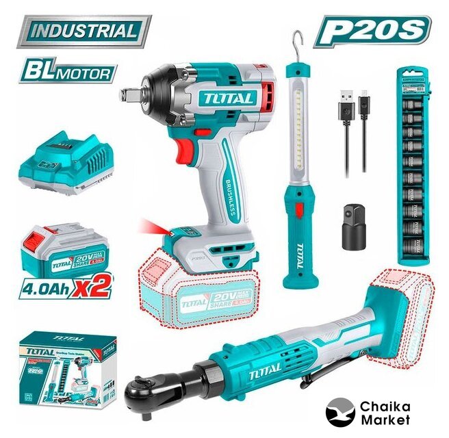 Комплектация | - Гайковерт TIWLI2050 - 1 шт.- Трещотка TOTAL TDRLI2060151 - 1 шт.- Фонарь TOTAL TWLI35261 - 1 шт.- Аккумулятор TFBLI2002 4,0 Ач - 2 шт.- Зарядное устройство TFCLI2001 - 1 шт.- Переходник 3/8" квадрат / 1/2" квадрат - 1 шт.- Ударные торцевые головки - 10 шт.- Кабель USB для зарядки TWLI35261 - 1 шт.- Коробка |