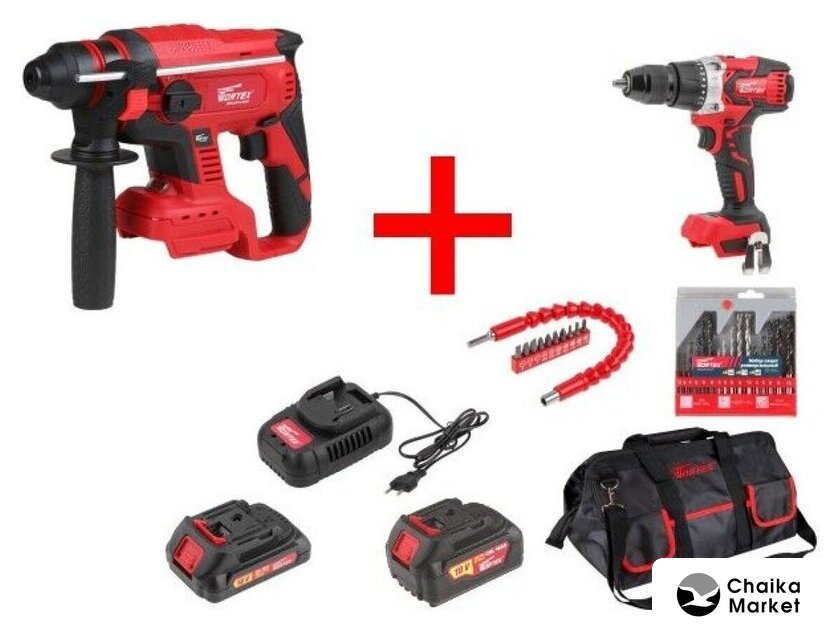| Комплектация | - Аккум. перфоратор WORTEX CRH 1820-1 в кор. ALL1 - 1 шт.;- Аккум. дрель-шуруповерт WORTEX BD 2030 DLi в кор. ALL1 - 1 шт.;- Аккумулятор WORTEX CBL 1820 18.0 В, 2.0 Ач, Li-Ion ALL1 - 1 шт.;- Аккумулятор WORTEX CBL 1840 18.0 В, 4.0 Ач, Li-Ion ALL1 - 1 шт.;- Зарядное устройство WORTEX FC 2120-1 ALL1 - 1 шт.;- Набор сверл универсальный 16 шт. WORTEX - 1 шт.;- Набор бит WORTEX FBS 11 (10 бит гибкий вал) - 1 шт.;- Сумка для инструмента WORTEX WB 1202 - 1 шт.; |