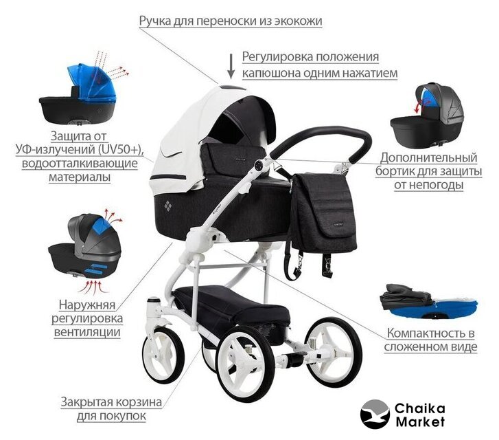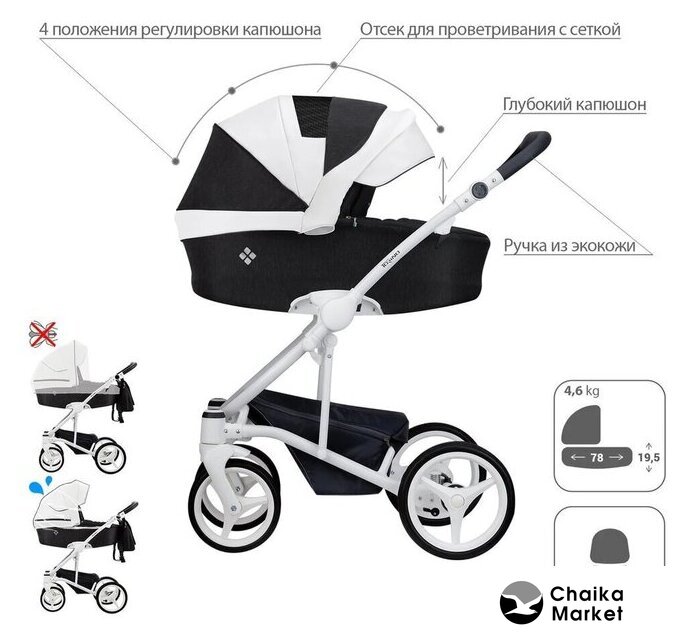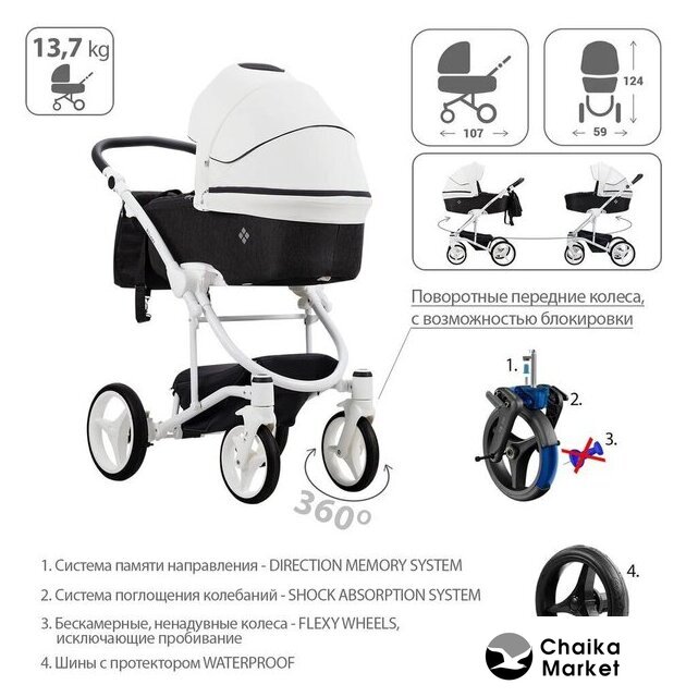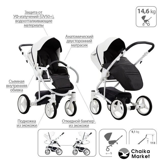 2 в 1 (люлька + прогулка), стиль: современный, ткань, шины цельные, вес 13.1 кг, цвет черный