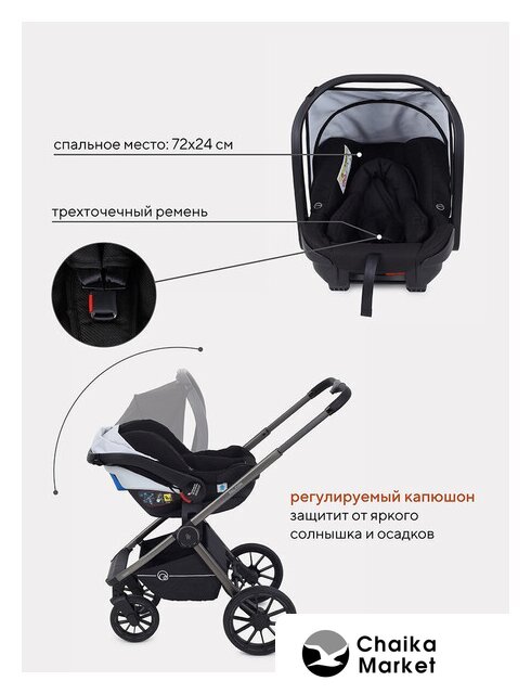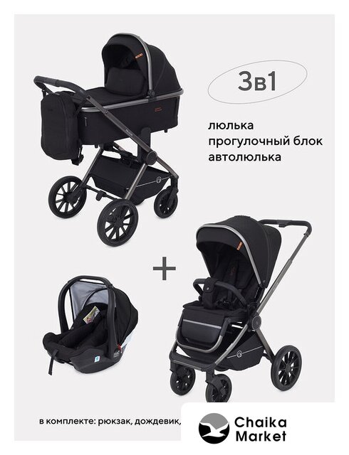 3 в 1 (прогулка + люлька + автокресло), стиль: современный, искусственная кожа, шины цельные, вес 14 кг, цвет черный