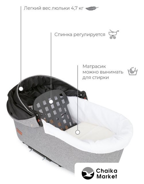 2 в 1 (люлька + прогулка), стиль: современный, ткань, вес 11.7 кг, цвет серый
