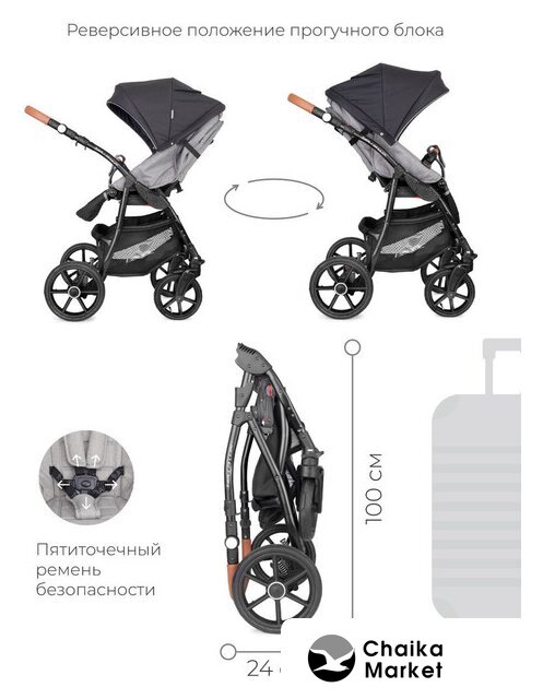 3 в 1 (прогулка + люлька + автокресло), стиль: современный, ткань, шины надувные, вес 24.1 кг, цвет серый