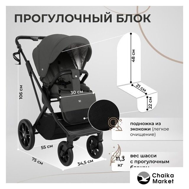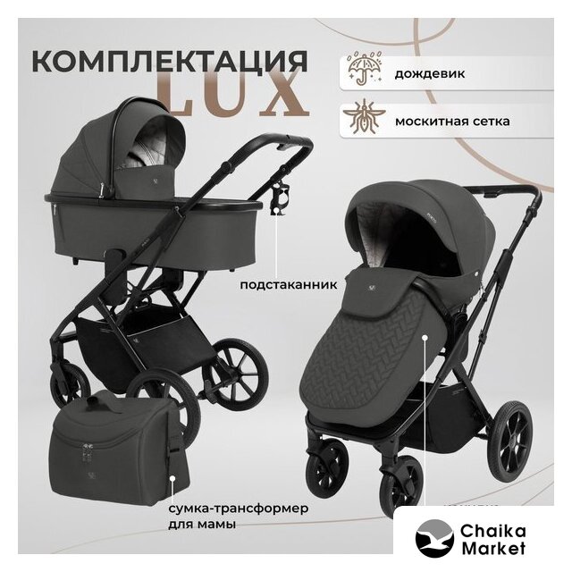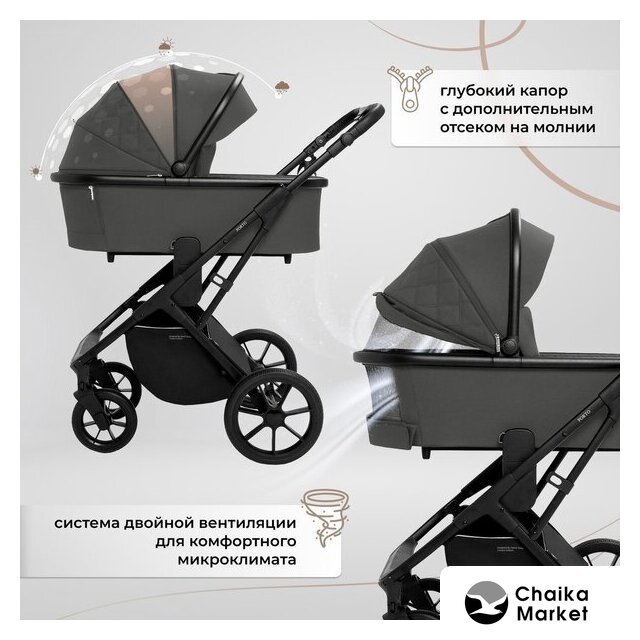 2 в 1 (люлька + прогулка), стиль: современный, ткань/искусственная кожа, шины надувные, вес 15.1 кг, цвет серый/темно-серый