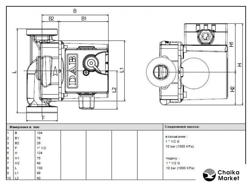 циркуляционный, 0.7 м³/ч, напор 1.2 м, давление 10 бар