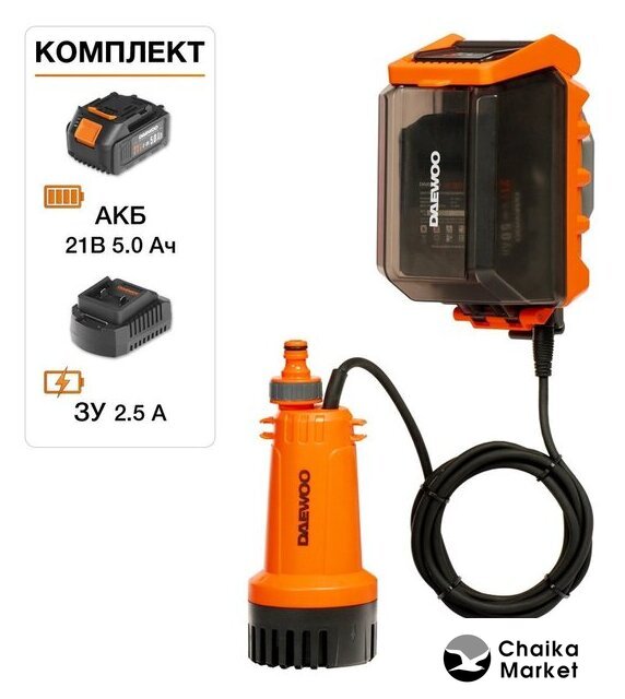 | Комплектация | - Насос;- Аккумулятор DABT 5021Li;- Зарядное устройство DACH 2521Li;- Адаптер для быстросъемного коннектора;- Крепление на стену;- Крюк для фиксации со шлангом;- Инструкция по эксплуатации;- Гарантийный талон.Товар совместим со всеми аккумуляторными батареями и зарядными устройствами DAEWOO линейки 21В |