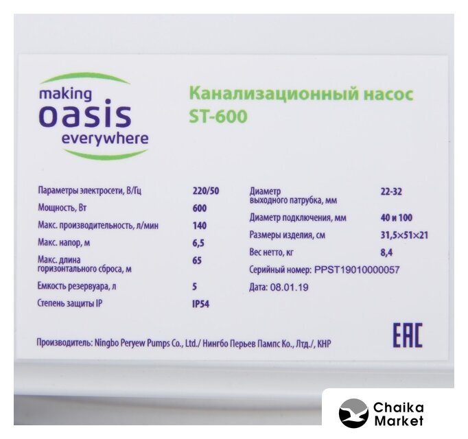 канализационная установка, 6 м³/ч, напор 6.5 м
