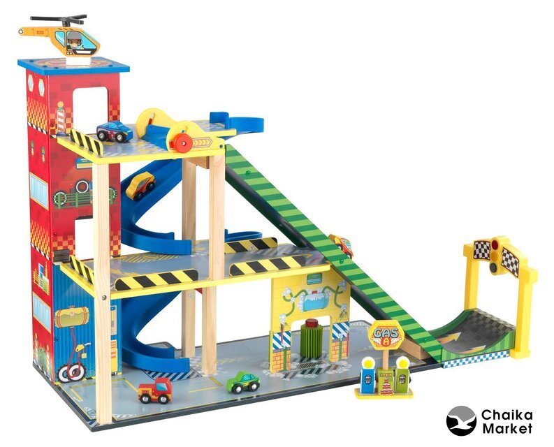 Состав набора | - Трехуровневый спиральный винтовой съезд- Гараж с парковкой- Лифт, который поднимает автомобили к гоночным съездам- Автозаправочная станция- Автомойка с движущимися щетками- Вертолетная площадка- Вертолет, 5 игрушечных автомобилей- Светофор с индикатором отсчета времени до старта гонки |