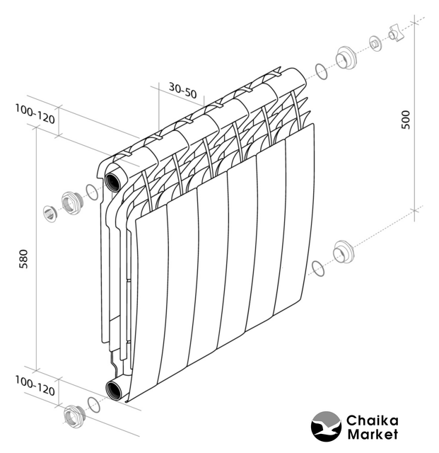 биметаллический, боковое подключение, ΔТ = 70 K: 684 Вт, высота: 574 мм, межосевое расстояние: 500 мм, посадочный диаметр: 1/2"