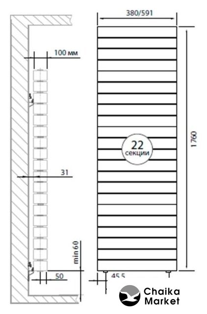 дизайн-радиатор, нижнее подключение, ΔТ = 70 K: 2688 Вт, высота: 1800 мм, межосевое расстояние: 1740 мм, посадочный диаметр: 1/2"