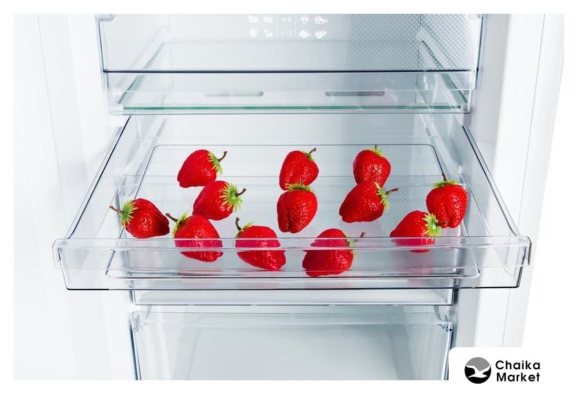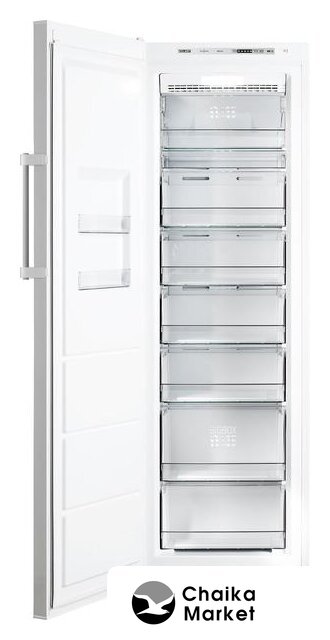 отдельностоящий, без No Frost, электронное управление, класс A+, полезный объём: 347 л (228 + 119 л), зона свежести, перенавешиваемые двери, выдвижной/подвесной контейнер, лоток для яиц, 59.5x62.7x196.8 см, белый