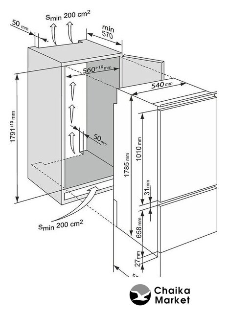 встраиваемый, скользящие направляющие, без No Frost, механическое управление, полезный объём: 273 л (194 + 79 л), перенавешиваемые двери, лоток для яиц, 54x54.5x177 см, белый