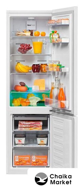 отдельностоящий, полный No Frost, электронное управление, класс A+, полезный объём: 320 л (220 + 100 л), перенавешиваемые двери, лоток для яиц, 59.5x65x186 см, белый