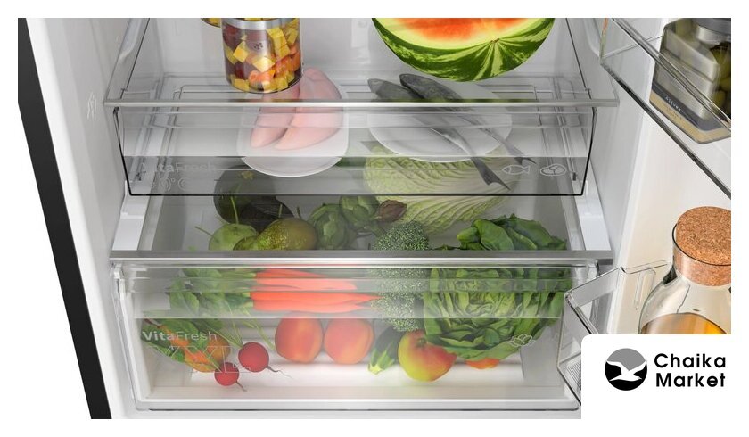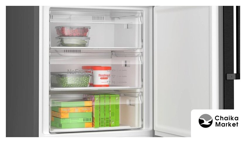отдельностоящий, полный No Frost, электронное управление, полезный объём: 363 л (260 + 103 л), зона свежести, перенавешиваемые двери, нулевой зазор, полка для вина, лоток для яиц, отделка: защита от отпечатков, 60x72x203 см, черный