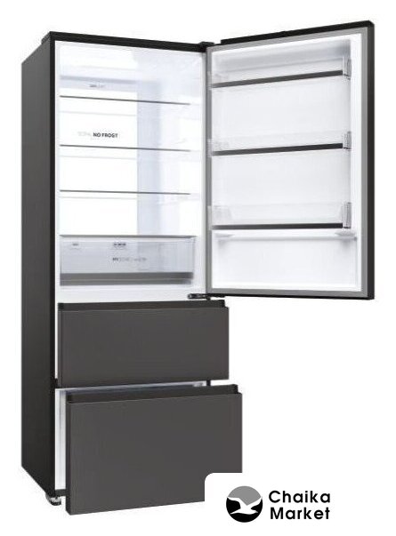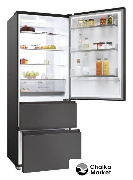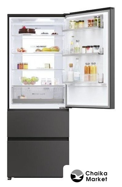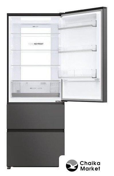 отдельностоящий, полный No Frost, сенсорное управление, полезный объём: 387 л (277 + 110 л), инверторный компрессор, зона свежести, перенавешиваемые двери, нулевой зазор, полка для вина, 59.5x67.5x203 см, графит/темная сталь
