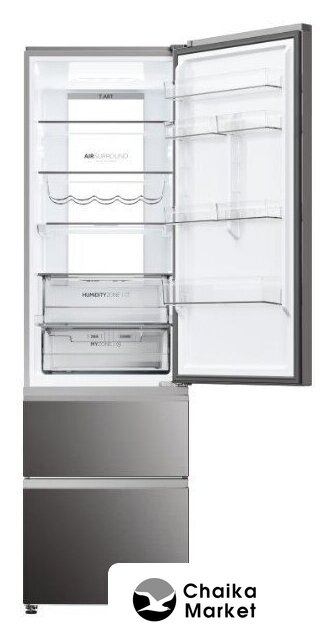 отдельностоящий, полный No Frost, электронное управление, полезный объём: 344 л (234 + 110 л), инверторный компрессор, зона свежести, перенавешиваемые двери, лоток для яиц, 59.5x67.5x186 см, серебристый