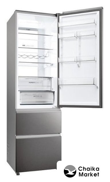отдельностоящий, полный No Frost, сенсорное управление, полезный объём: 386 л (276 + 110 л), инверторный компрессор, зона свежести, перенавешиваемые двери, нулевой зазор, диспенсер, полка для вина, лоток для яиц, 59.5x68.2x203 см, серебристый