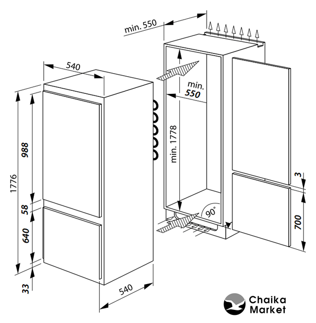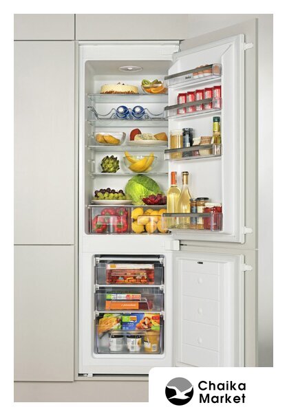 встраиваемый, без No Frost, электронное управление, класс A+, перенавешиваемые двери, лоток для яиц, 59.6x55x82 см, белый