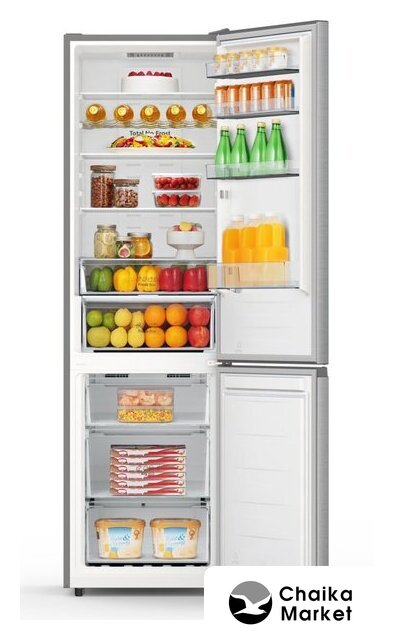 отдельностоящий, No Frost (морозильная камера), сенсорное управление, полезный объём: 361 л (258 + 103 л), зона свежести, перенавешиваемые двери, складная полка, лоток для яиц, 59.7x67.5x201.5 см, темная сталь