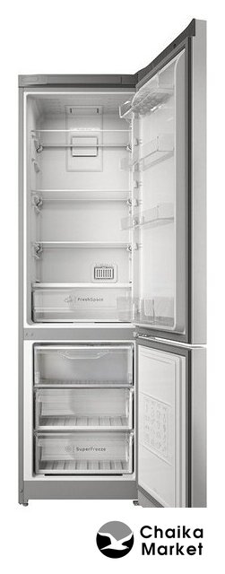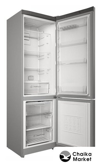 отдельностоящий, без No Frost, электронное управление, класс A+, полезный объём: 341 л (182 + 159 л), лоток для яиц, подставка-лоток для бутылок, 59.5x62.9x196.8 см, серебристый