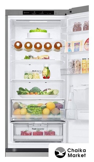 отдельностоящий, полный No Frost, сенсорное управление, полезный объём: 414 л (289 + 125 л), инверторный компрессор, зона свежести, складная полка, полка для вина, лоток для яиц, 59.5x67x205 см, нержавеющая сталь
