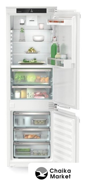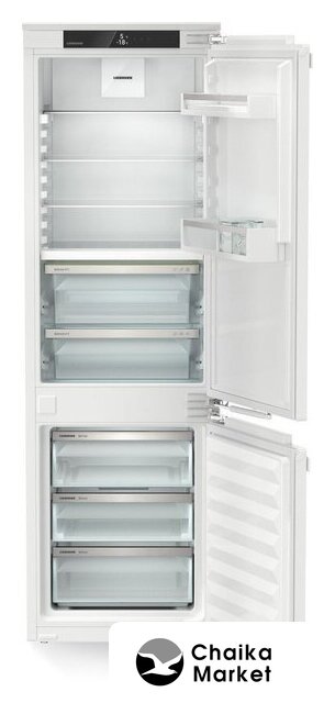 встраиваемый, плоские шарниры, полный No Frost, электронное управление, полезный объём: 298 л (224 + 74 л), инверторный компрессор, зона свежести, перенавешиваемые двери, выдвижная полка, полка для вина, лоток для яиц, 54x55x193.5 см, белый