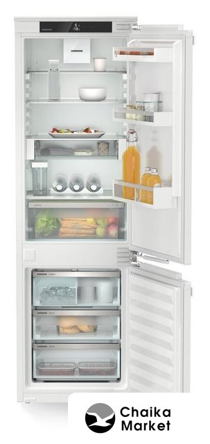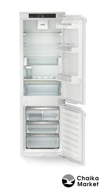 встраиваемый, плоские шарниры, полный No Frost, электронное управление, полезный объём: 298 л (224 + 74 л), инверторный компрессор, зона свежести, перенавешиваемые двери, выдвижная полка, полка для вина, лоток для яиц, 54x55x193.5 см, белый